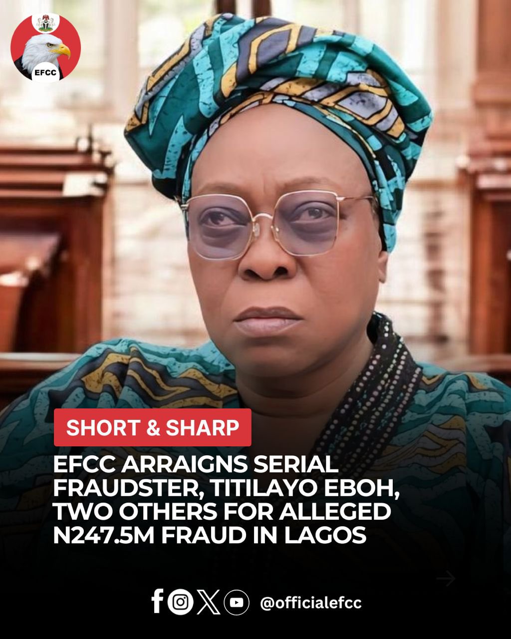 The Economic and Financial Crimes Commission (EFCC), Lagos Zonal Directorate 2, on Friday, January 30, 2026, arraigned an alleged serial fraudster, Titilayo Funmilayo Eboh, before Justice Ramon Oshodi of the State High Court sitting in Ikeja, Lagos, over an alleged fraud involving N247,500,000.00 (Two Hundred and Forty-Seven Million Five Hundred Thousand Naira).